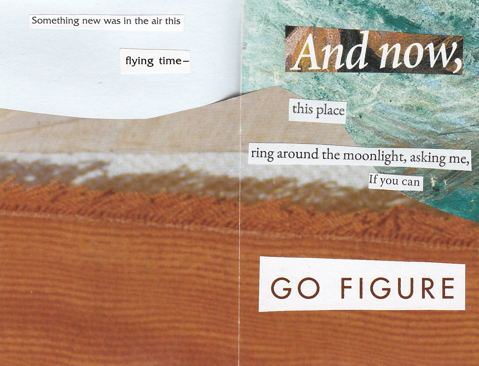 a collaged 8 page minizine compiled from lines that were eavesdropped intentionally (a concept prompt taught to me by Carson Jordan) from Crosby, Stills, and Nash, Hanif Abdurraqib, and text+images sourced from pastel magazine, travel magazines, and advertisement mailers