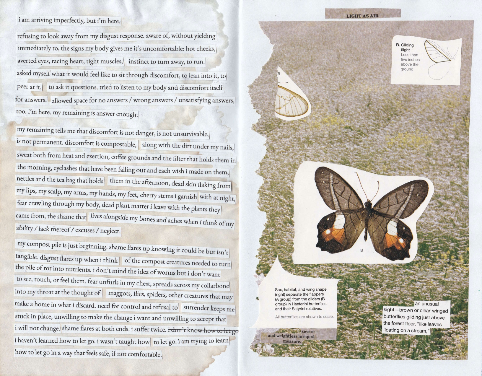 16-page fullsize zine about what it takes to surrender control, accept impermanence, and compost emotional material made using images from pastel magazine, local travel magazines, france magazine, last year's audubon calendar, a printed definition of the word tendril, and materials sent to me in the mail by nat raum, on paper altered by coffee, tea, cherry stems, and oil pastels.